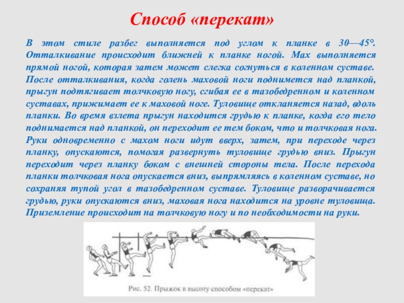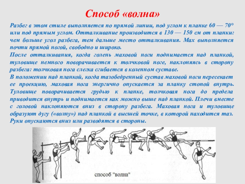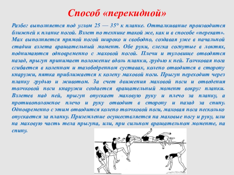 прямой ногой, которая затем может слегка согнуться в коленном суставе. После отталкивания, когда голень маховой ноги поднимется над планкой, прыгун подтягивает толчковую ногу, сгибая ее в тазобедренном и коленном суставах, прижимает ее к маховой ноге. Туловище откланяется назад, вдоль планки. Во время взлета прыгун находится грудью к планке, когда его тело поднимается над планкой, он переходит ее тем боком, что и толчковая нога. Руки одновременно с махом ноги идут вверх, затем, при переходе через планку, опускаются, помогая развернуть туловище грудью вниз. Прыгун переходит через планку боком с внешней стороны тела. После перехода планки толчковая нога опускается вниз, выпрямляясь в коленном суставе, но сохраняя тупой угол в тазобедренном суставе. Туловище разворачивается грудью, руки опускаются вниз, маховая нога находится на уровне туловища. Приземление происходит на толчковую ногу и по необходимости на руки.