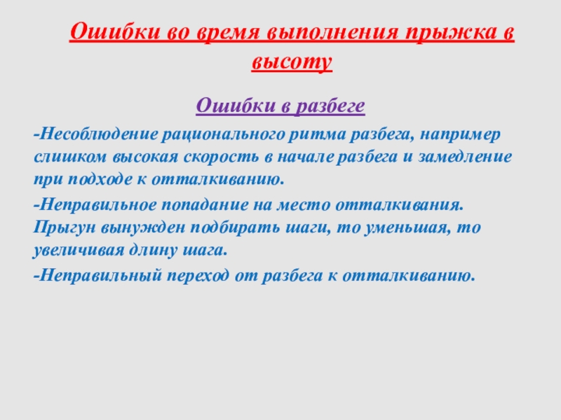 Слайд 13Ошибки во время выполнения прыжка в высоту