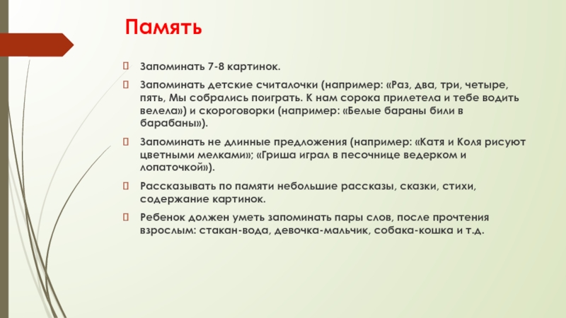 Ребенок должен уметь запоминать пары слов, после прочтения взрослым: стакан-вода, девочка-мальчик, собака-кошка и т.д.
