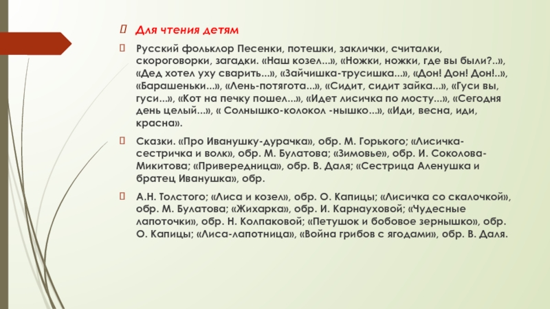 A.Н. Толстого; «Лиса и козел», обр. О. Капицы; «Лисичка со скалочкой», обр. М. Булатова; «Жихарка», обр. И. Карнауховой; «Чудесные лапоточки», обр. Н. Колпаковой; «Петушок и бобовое зернышко», обр. О. Капицы; «Лиса-лапотница», «Война грибов с ягодами», обр. В. Даля.