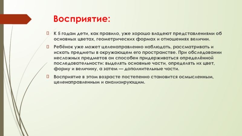 Восприятие в этом возрасте постепенно становится осмысленным, целенаправленным и анализирующим.