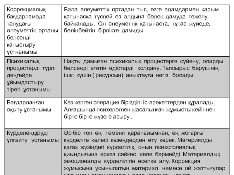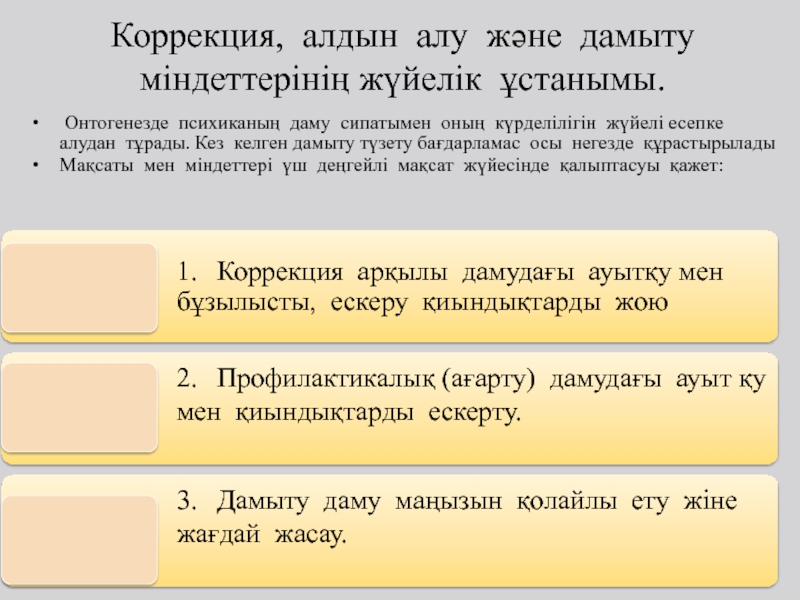 Слайд 8Коррекция, алдын алу және дамыту міндеттерінің жүйелік ұстанымы.