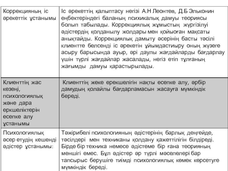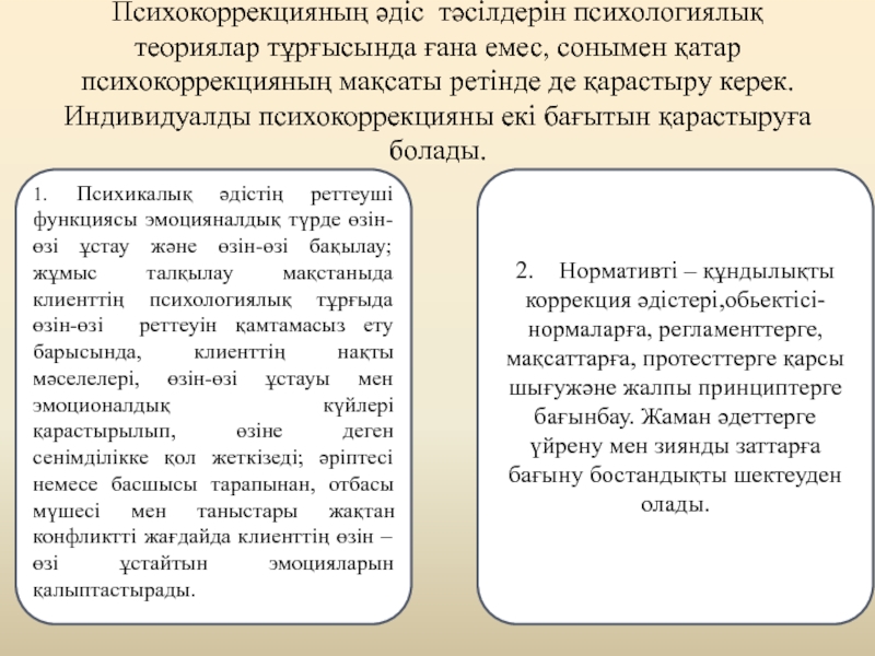 Слайд 2Психокоррекцияның әдіс тәсілдерін психологиялық теориялар тұрғысында ғана емес, сонымен қатар