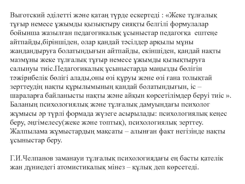 Слайд 17Выготский әділетті және қатаң түрде ескертеді : «Жеке тұлғалық тұғыр