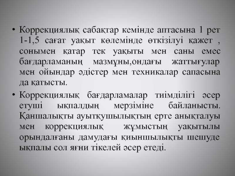 Слайд 13Коррекциялық сабақтар кемінде аптасына 1 рет 1-1,5 сағат уақыт көлемінде