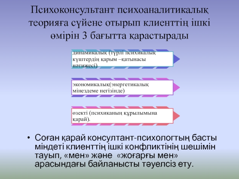 Слайд 5Психоконсультант психоаналитикалық теорияға сүйене отырып клиенттің ішкі өмірін 3 бағытта