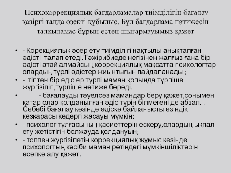 Слайд 15 Психокоррекциялық бағдарламалар тиімділігін бағалау қазіргі таңда өзекті құбылыс. Бұл