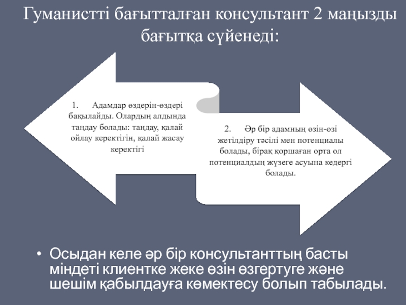 Слайд 6Гуманистті бағытталған консультант 2 маңызды бағытқа сүйенеді: