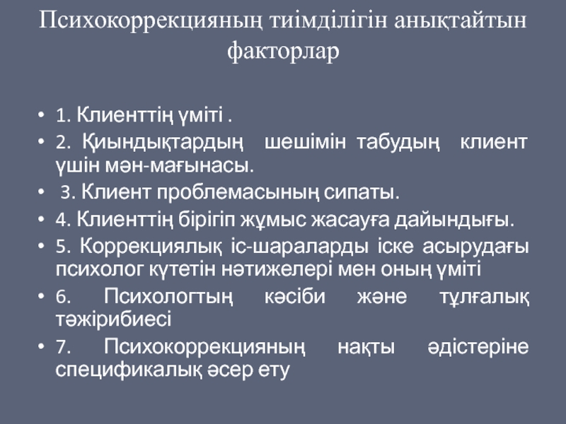 Слайд 14Психокоррекцияның тиімділігін анықтайтын факторлар