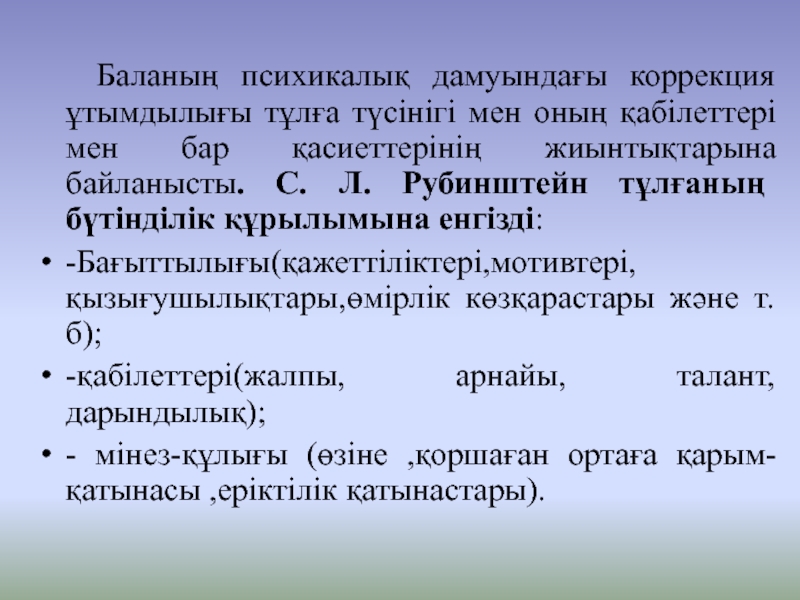 оның қабілеттері мен бар қасиеттерінің жиынтықтарына байланысты. С. Л. Рубинштейн