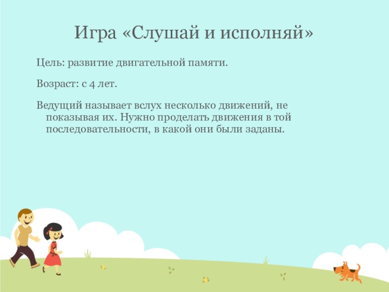 называет вслух несколько движений, не показывая их. Нужно проделать движения