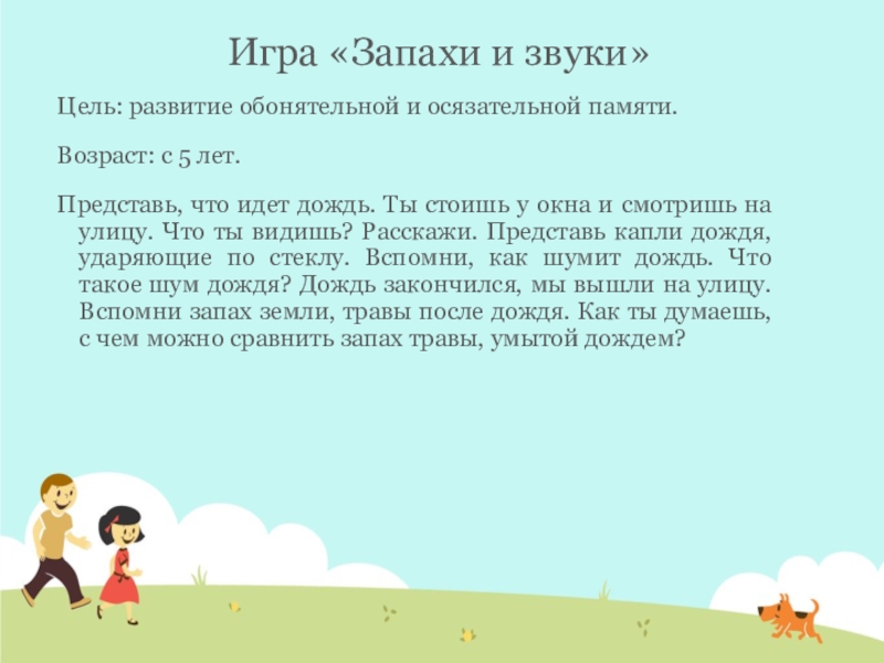 Что ты видишь? Расскажи. Представь капли дождя, ударяющие по стеклу. Вспомни, как шумит дождь. Что такое шум дождя? Дождь закончился, мы вышли на улицу. Вспомни запах земли, травы после дождя. Как ты думаешь, с чем можно сравнить запах травы, умытой дождем?