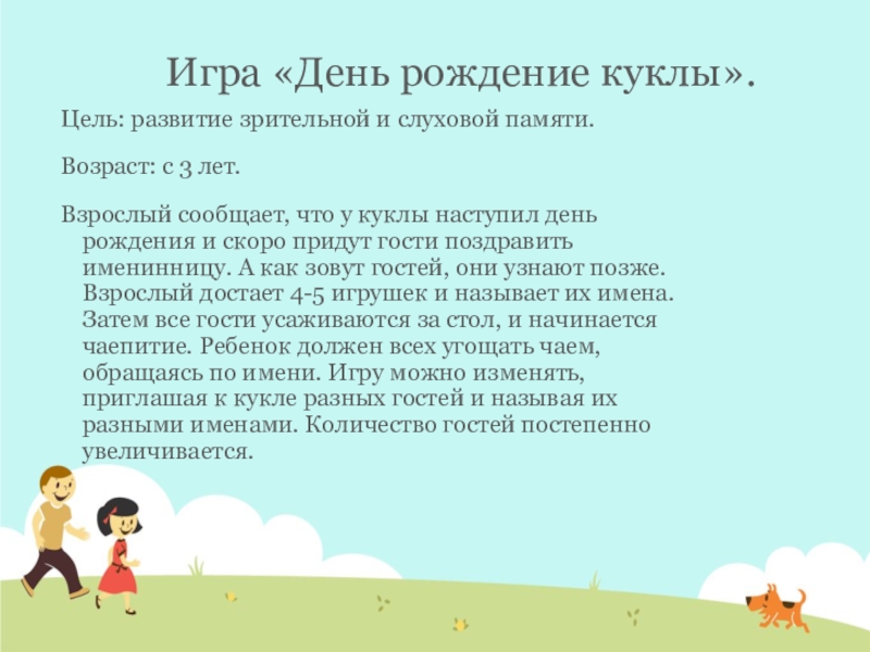 скоро придут гости поздравить именинницу. А как зовут гостей, они узнают позже. Взрослый достает 4-5 игрушек и называет их имена. Затем все гости усаживаются за стол, и начинается чаепитие. Ребенок должен всех угощать чаем, обращаясь по имени. Игру можно изменять, приглашая к кукле разных гостей и называя их разными именами. Количество гостей постепенно увеличивается.