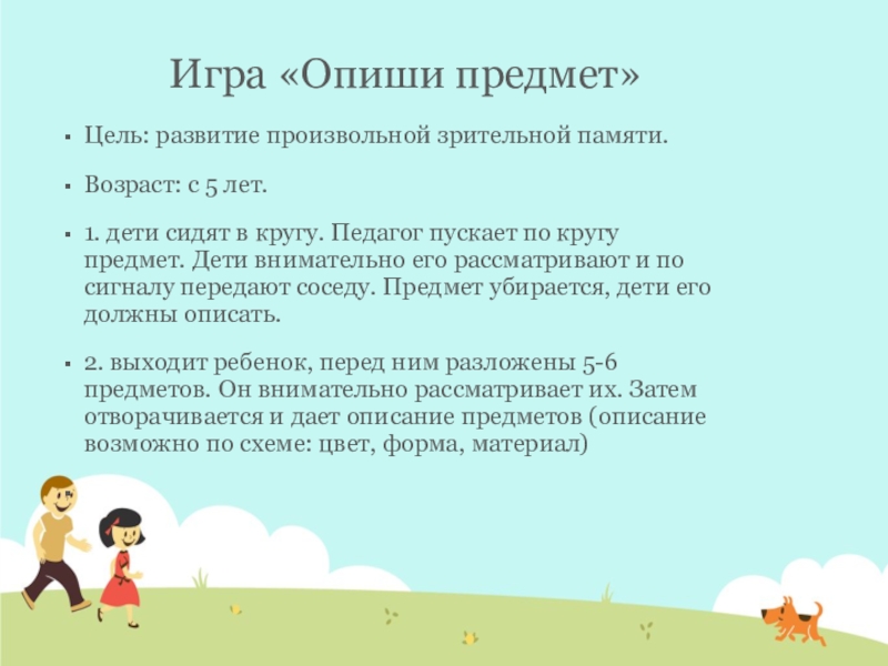 внимательно его рассматривают и по сигналу передают соседу. Предмет убирается, дети его должны описать.
