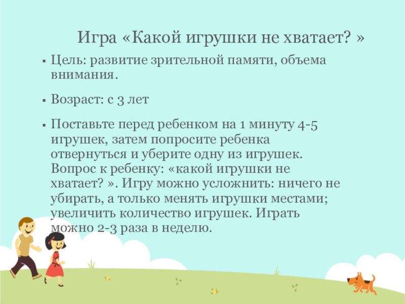 игрушек, затем попросите ребенка отвернуться и уберите одну из игрушек. Вопрос к ребенку: «какой игрушки не хватает? ». Игру можно усложнить: ничего не убирать, а только менять игрушки местами; увеличить количество игрушек. Играть можно 2-3 раза в неделю.