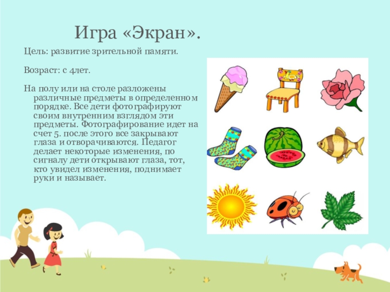быть изображен один предмет. Игру можно провести как соревнование между несколькими детьми. Играющие рассматривают картинки, убираются и все называют те картинки, которые запомнили. Можно назвать по очереди по одной картинке выигрывает тот, кто последним вспомнит картинку, еще не названную другими