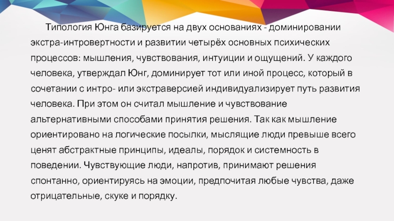 Слайд 13Типология Юнга базируется на двух основаниях - доминировании экстра-интровертности и