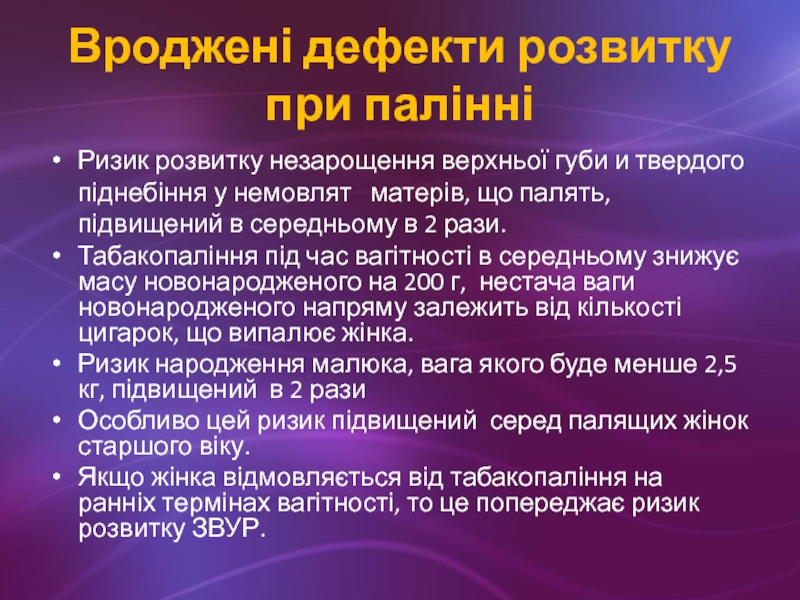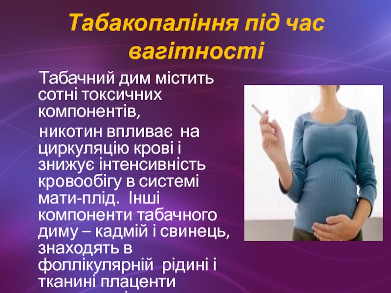 знижує інтенсивність кровообігу в системі мати-плід. Інші компоненти табачного диму – кадмій і свинець, знаходять в фоллікулярній рідині і тканині плаценти курильщиків.