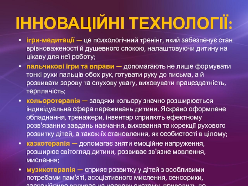 музикотерапія — сприяє розвитку у дітей з особливими потребами пам'яті, асоціативного мислення, сенсорики, заспокійливо впливає на нервову систему, приводить до рівноваги процеси збудження та гальмування.