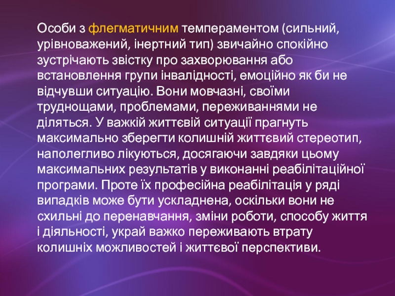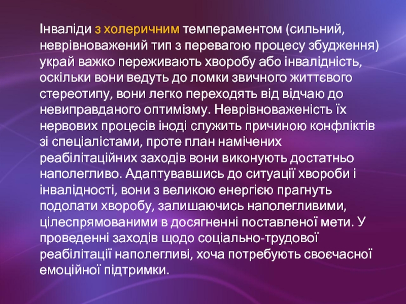інвалідності, емоційно як би не відчувши ситуацію. Вони мовчазні, своїми труднощами, проблемами, переживаннями не діляться. У важкій життєвій ситуації прагнуть максимально зберегти колишній життєвий стереотип, наполегливо лікуються, досягаючи завдяки цьому максимальних результатів у виконанні реабілітаційної програми. Проте їх професійна реабілітація у ряді випадків може бути ускладнена, оскільки вони не схильні до перенавчання, зміни роботи, способу життя і діяльності, украй важко переживають втрату колишніх можливостей і життєвої перспективи.