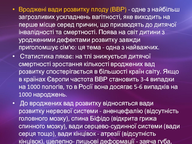 Слайд 3Вроджені вади розвитку плоду (ВВР) - одне з найбільш загрозливих