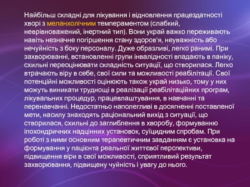 хворі з меланхолічним темпераментом (слабкий, неврівноважений, інертний тип). Вони украй
