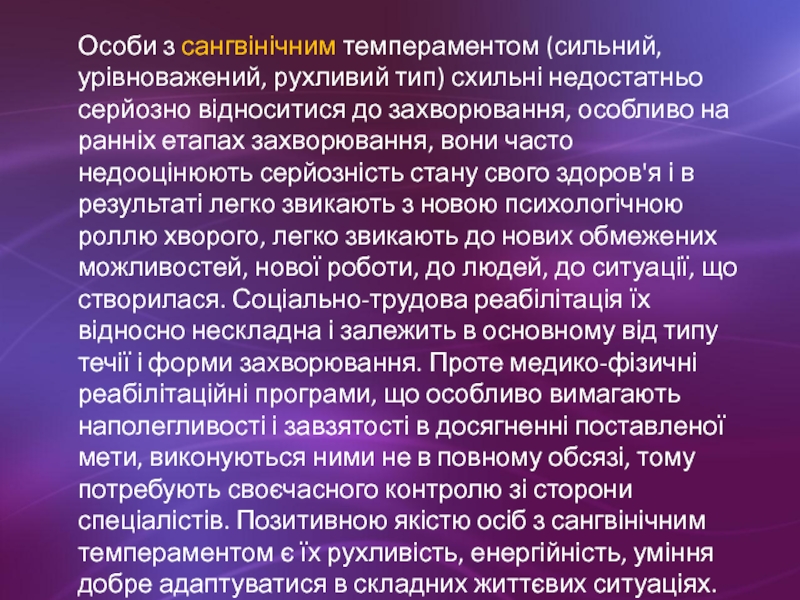 етапах захворювання, вони часто недооцінюють серйозність стану свого здоров'я і в результаті легко звикають з новою психологічною роллю хворого, легко звикають до нових обмежених можливостей, нової роботи, до людей, до ситуації, що створилася. Соціально-трудова реабілітація їх відносно нескладна і залежить в основному від типу течії і форми захворювання. Проте медико-фізичні реабілітаційні програми, що особливо вимагають наполегливості і завзятості в досягненні поставленої мети, виконуються ними не в повному обсязі, тому потребують своєчасного контролю зі сторони спеціалістів. Позитивною якістю осіб з сангвінічним темпераментом є їх рухливість, енергійність, уміння добре адаптуватися в складних життєвих ситуаціях.