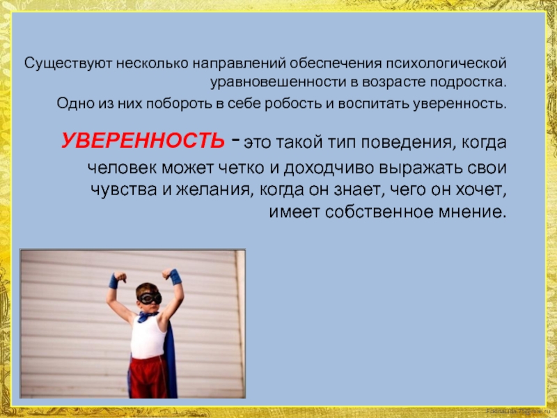 Существуют несколько направлений обеспечения психологической уравновешенности в возрасте подростка.Одно из них побороть в себе робость и воспитать