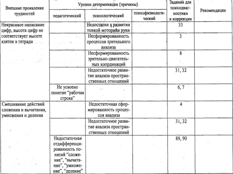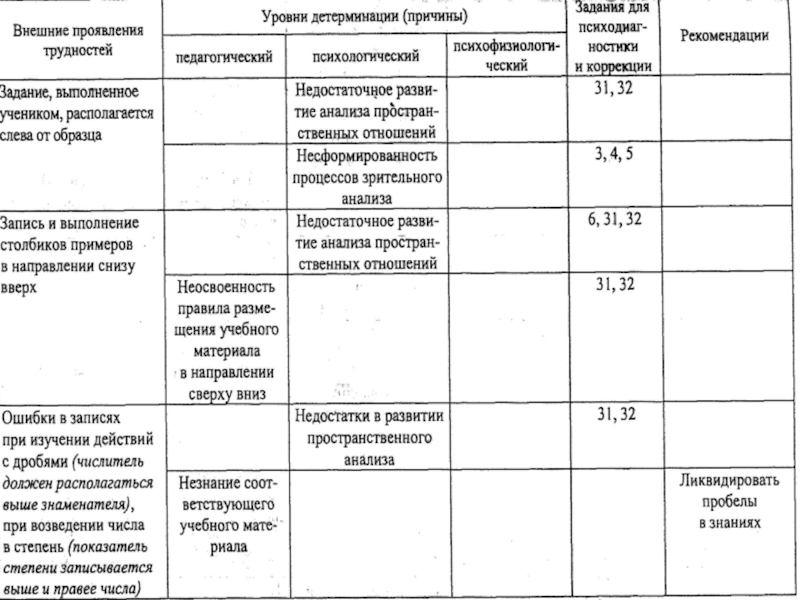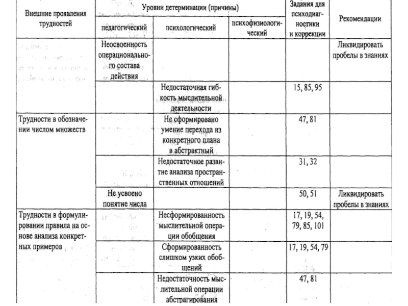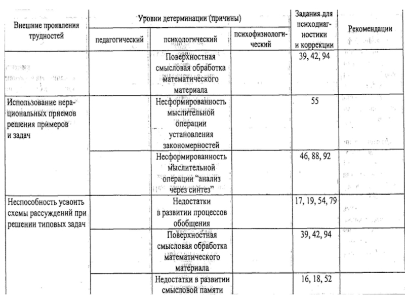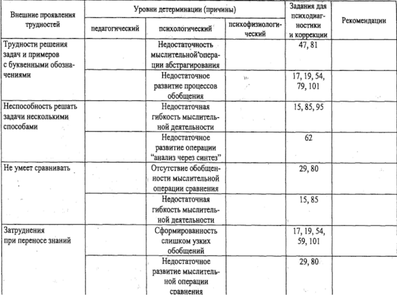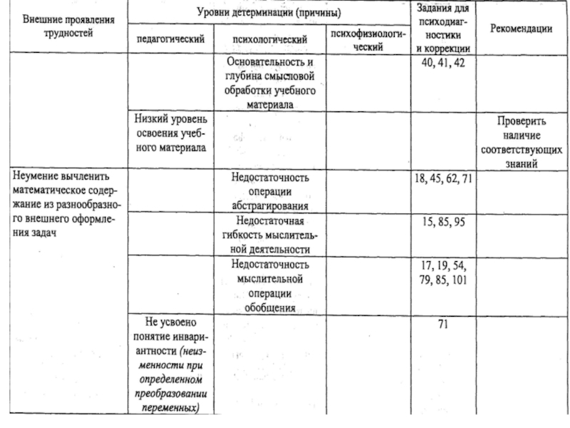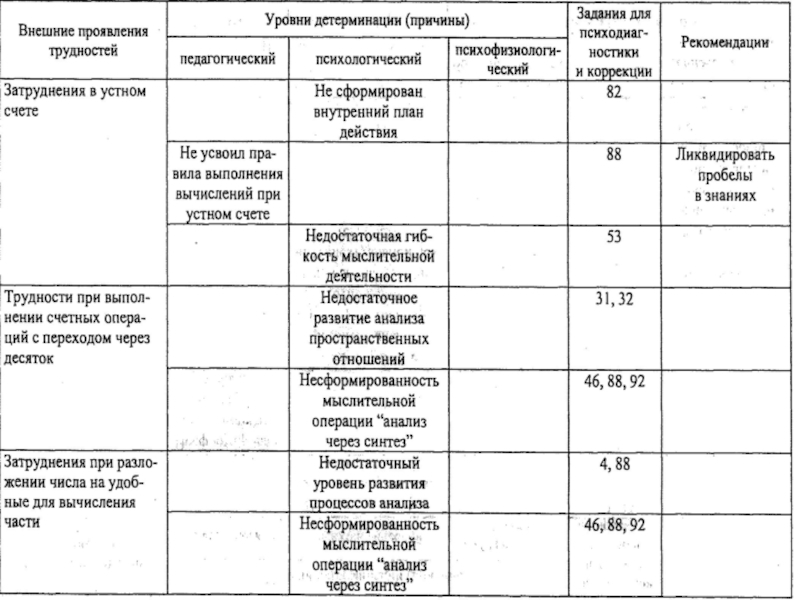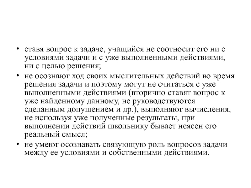 не осознают ход своих мыслительных действий во время решения задачи и поэтому могут не считаться с уже выполненными действиями (вторично ставят вопрос к уже найденному данному, не руководствуются сделанным допущением и др.), выполняют вычисления, не используя уже полученные результаты, при выполнении действий школьнику бывает неясен его реальный смысл;