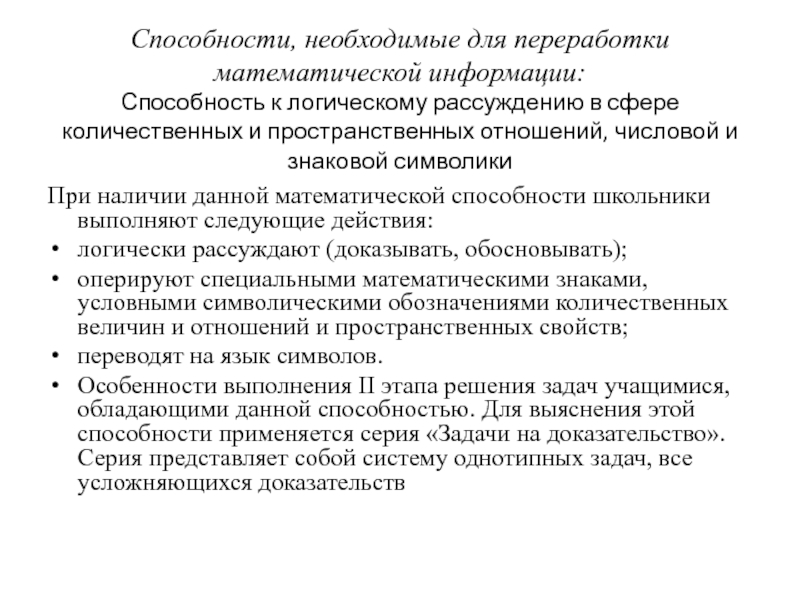 Особенности выполнения II этапа решения задач учащимися, обладающими данной способностью. Для выяснения этой способности применяется серия «Задачи на доказательство». Серия представляет собой систему однотипных задач, все усложняющихся доказательств