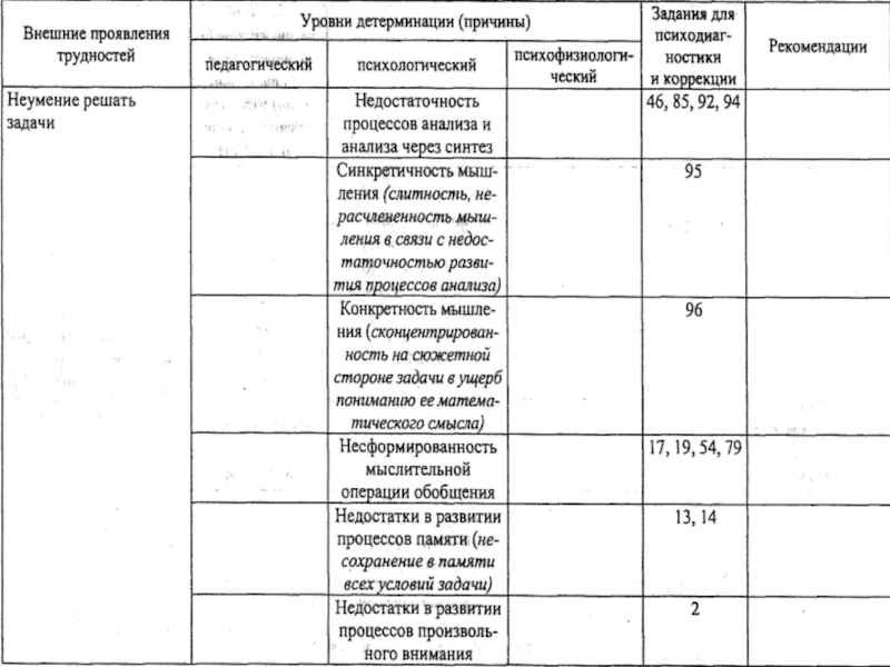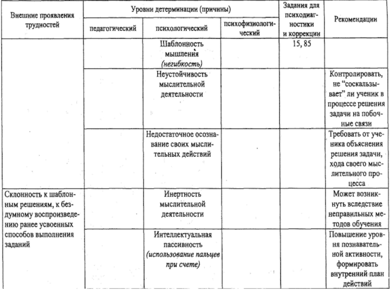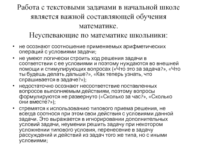 не умеют логически строить ход решения задачи в соответствии с ее условиями и поэтому нуждаются во внешней помощи и стимулирующих вопросах («Что это за задача?», «Что ты будешь делать дальше?», «Как теперь узнать, что спрашивается в задаче?»);