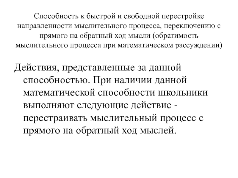 Действия, представленные за данной способностью. При наличии данной математической способности школьники выполняют следующие действие - перестраивать мыслительный процесс с прямого на обратный ход мыслей.