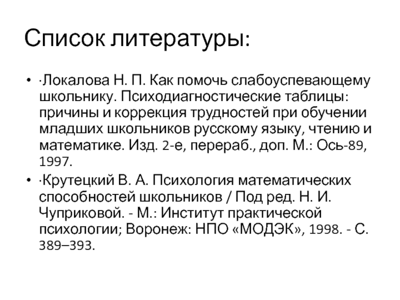 ·Крутецкий В. А. Психология математических способностей школьников / Под ред. Н. И. Чуприковой. - М.: Институт практической психологии; Воронеж: НПО «МОДЭК», 1998. - С. 389–393.