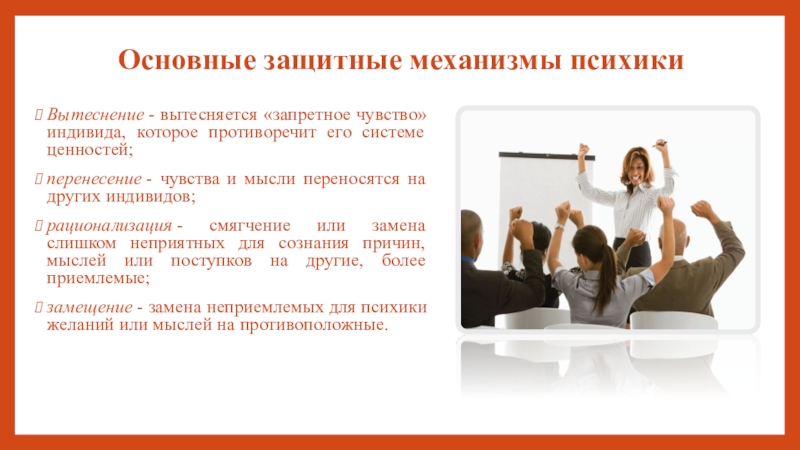 Вытеснение - вытесняется «запретное чувство» индивида, которое противоречит