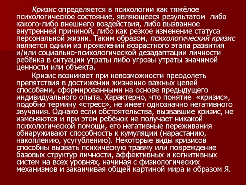 Кризис возникает при невозможности преодолеть препятствия в достижении жизненно важных целей способами, сформированными на основе предыдущего индивидуального опыта. Характерно, что понятие «кризис», подобно термину «стресс», не имеет однозначно негативного звучания. Однако если обстоятельства, вызвавшие кризис, не изменяются и при этом ребёнок не получает никакой психологической помощи, его негативные переживания обнаруживают способность к кумуляции (нарастанию, накоплению, усугублению). Некоторые виды кризисов способны вызвать психическую травму или повреждение базовых структур личности, аффективных и когнитивных систем на всех уровнях, начиная с физиологических механизмов и заканчивая общей картиной мира и образом Я.