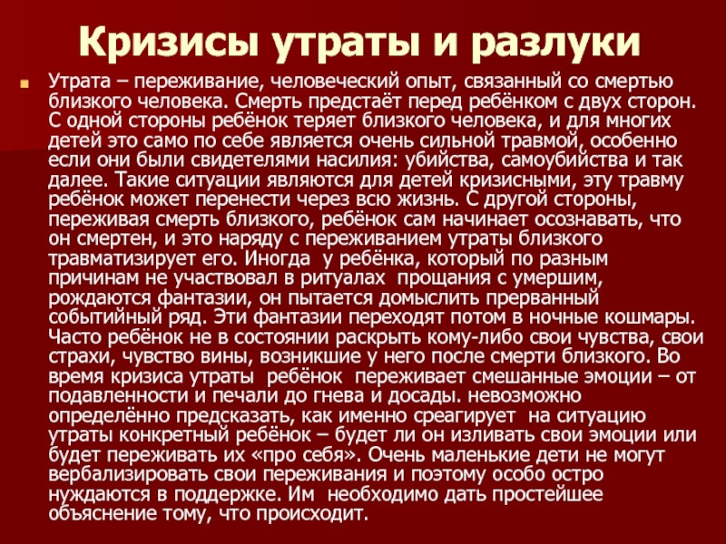 С одной стороны ребёнок теряет близкого человека, и для многих детей это само по себе является очень сильной травмой, особенно если они были свидетелями насилия: убийства, самоубийства и так далее. Такие ситуации являются для детей кризисными, эту травму ребёнок может перенести через всю жизнь. С другой стороны, переживая смерть близкого, ребёнок сам начинает осознавать, что он смертен, и это наряду с переживанием утраты близкого травматизирует его. Иногда у ребёнка, который по разным причинам не участвовал в ритуалах прощания с умершим, рождаются фантазии, он пытается домыслить прерванный событийный ряд. Эти фантазии переходят потом в ночные кошмары. Часто ребёнок не в состоянии раскрыть кому-либо свои чувства, свои страхи, чувство вины, возникшие у него после смерти близкого. Во время кризиса утраты ребёнок переживает смешанные эмоции – от подавленности и печали до гнева и досады. невозможно определённо предсказать, как именно среагирует на ситуацию утраты конкретный ребёнок – будет ли он изливать свои эмоции или будет переживать их «про себя». Очень маленькие дети не могут вербализировать свои переживания и поэтому особо остро нуждаются в поддержке. Им необходимо дать простейшее объяснение тому, что происходит.