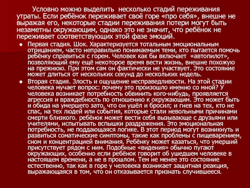 Слайд 13 Условно можно выделить несколько стадий переживания утраты. Если ребёнок переживает
