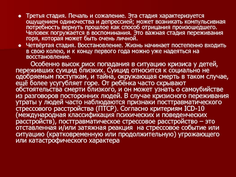 Особенно высок риск попадания в ситуацию кризиса у детей, переживших суицид близких. Суицид относится к социально не одобряемым поступкам, и тайна, окружающая смерть в таком случае, ещё более усугубляет горе. От ребёнка часто скрывают обстоятельства смерти близкого, и он может узнать о самоубийстве из разговоров посторонних людей. В случае кризисного переживания утраты у людей часто наблюдаются признаки посттравматического стрессового расстройства (ПТСР). Согласно критериям ICD-10 (международная классификация психических и поведенческих расстройств), посттравматическое стрессовое расстройство – это отставленная и/или затяжная реакция на стрессовое событие или ситуацию (кратковременную или продолжительную) угрожающего или катастрофического характера