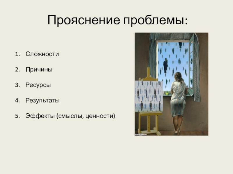 Прояснение проблемы: СложностиПричиныРесурсыРезультатыЭффекты (смыслы, ценности)