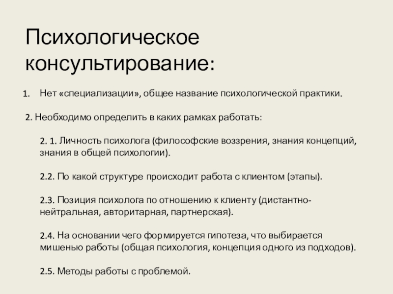 Психологическое консультирование:Нет «специализации», общее название психологической практики. 2. Необходимо определить в каких рамках работать:  2. 1.