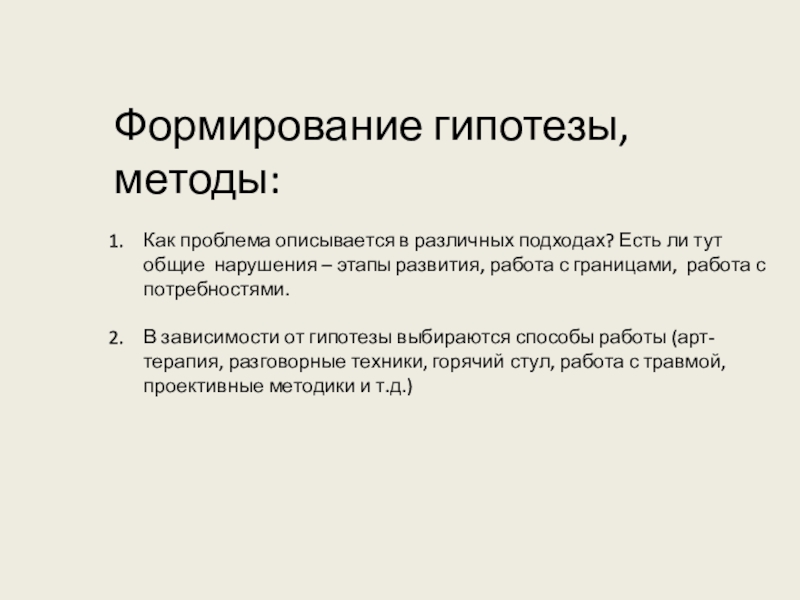 Формирование гипотезы, методы:Как проблема описывается в различных подходах? Есть ли тут общие нарушения – этапы развития, работа