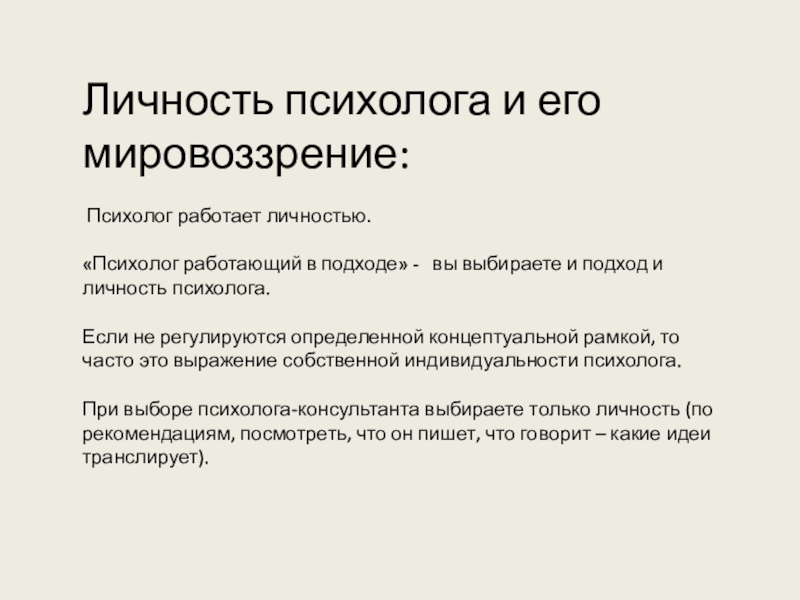Личность психолога и его мировоззрение:   Психолог работает личностью. «Психолог работающий в подходе» -  вы