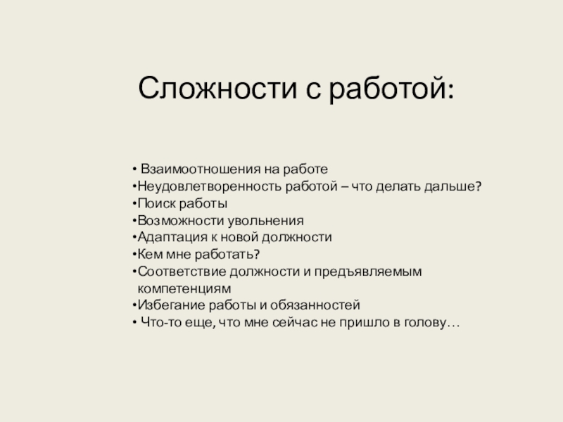 Сложности с работой: Взаимоотношения на работеНеудовлетворенность работой – что делать дальше?Поиск работыВозможности увольненияАдаптация к новой должностиКем мне