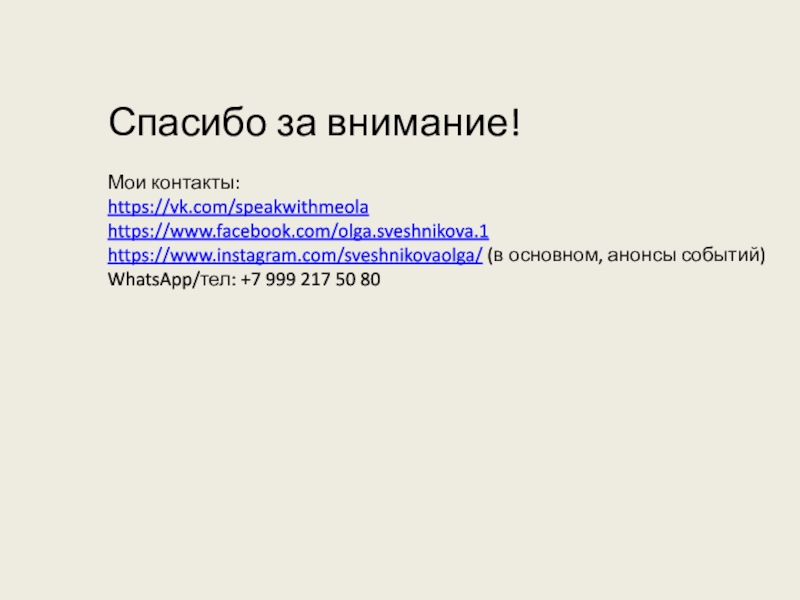 Слайд 9Спасибо за внимание! Мои контакты: https://vk.com/speakwithmeola https://www.facebook.com/olga.sveshnikova.1 https://www.instagram.com/sveshnikovaolga/ (в основном, анонсы событий) WhatsApp/тел: +7 999