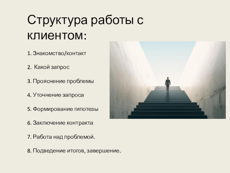 Слайд 4Структура работы с клиентом: 1. Знакомство/контакт 2. Какой запрос 3. Прояснение проблемы