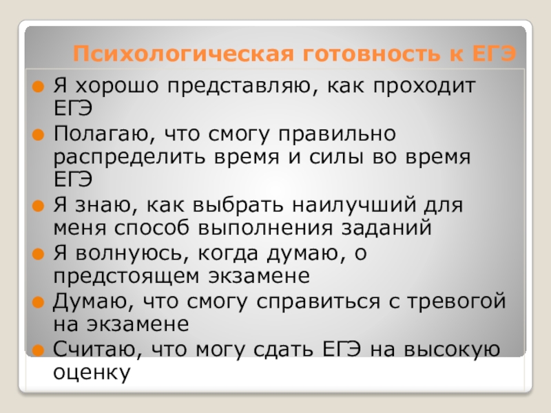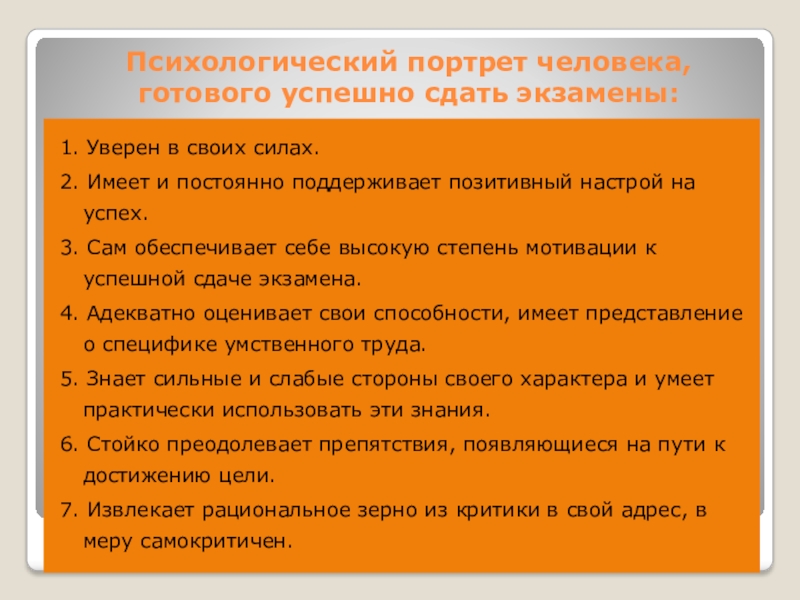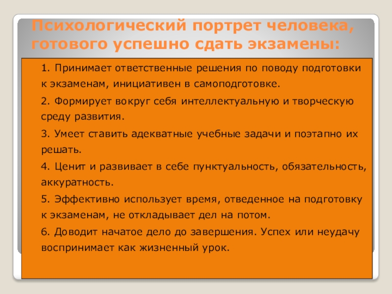 Слайд 10Психологический портрет человека, готового успешно сдать экзамены: