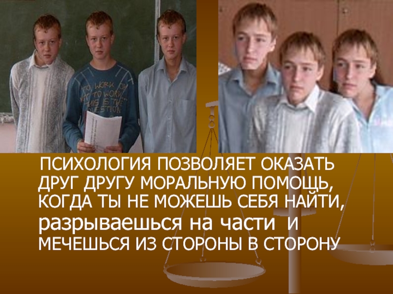 ПСИХОЛОГИЯ ПОЗВОЛЯЕТ ОКАЗАТЬ ДРУГ ДРУГУ МОРАЛЬНУЮ ПОМОЩЬ, КОГДА ТЫ НЕ МОЖЕШЬ СЕБЯ НАЙТИ, разрываешься на