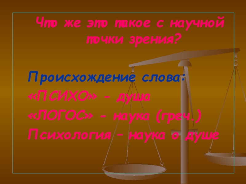 Что же это такое с научной точки зрения?Происхождение слова:«ПСИХО» - душа«ЛОГОС» - наука (греч.)Психология – наука о