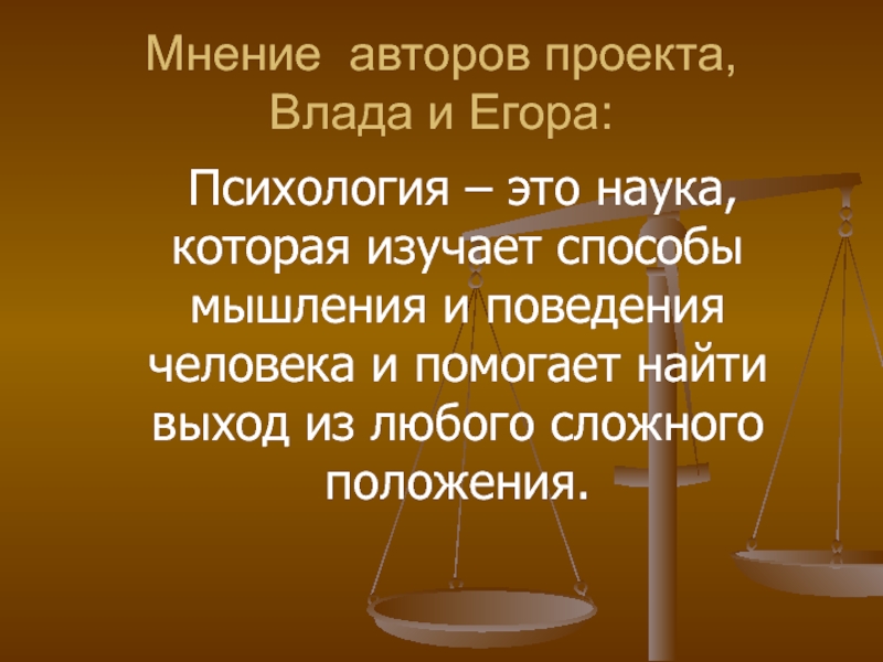 Мнение авторов проекта,  Влада и Егора:	Психология – это наука, которая изучает способы мышления и поведения человека