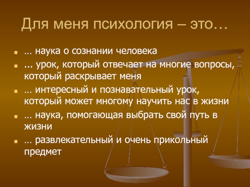 Для меня психология – это…… наука о сознании человека... урок, который отвечает на многие вопросы, который раскрывает